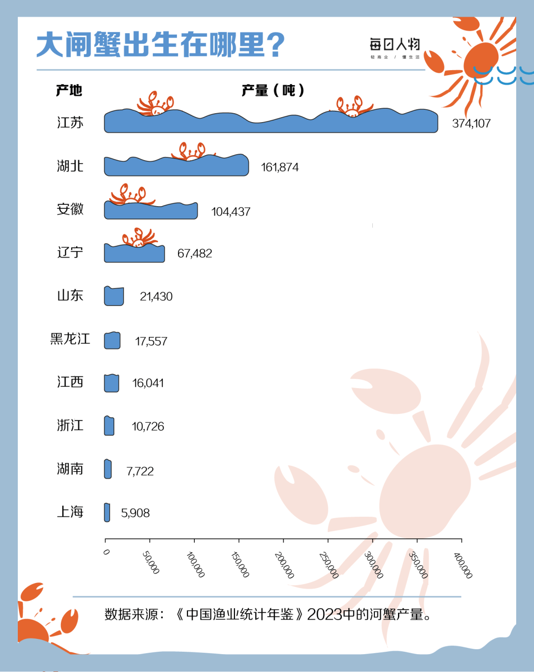农历九雌十雄,是品鉴大闸蟹的最好季节。根据《中国渔业统计年鉴》,我国大闸蟹的产量从2016到2023年,呈现整体递增趋势,2023年达到了顶峰——年产超70亿只大闸蟹,平均下来每个人至少能吃到4只。