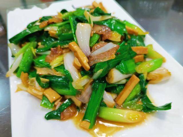 ③锅中放入猪油,放入咸肉炒。炒出咸肉的油脂后放入大蒜的茎,快速翻炒一会儿。倒入香干和叶子,加少许的盐,爆炒几下就可以食用了。