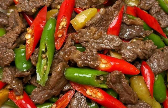 4.炒至辣椒断生以后,再加入炒好的牛肉一起翻炒均匀,接着加入少许的白糖提鲜,然后继续几下入味,即可出锅开吃。